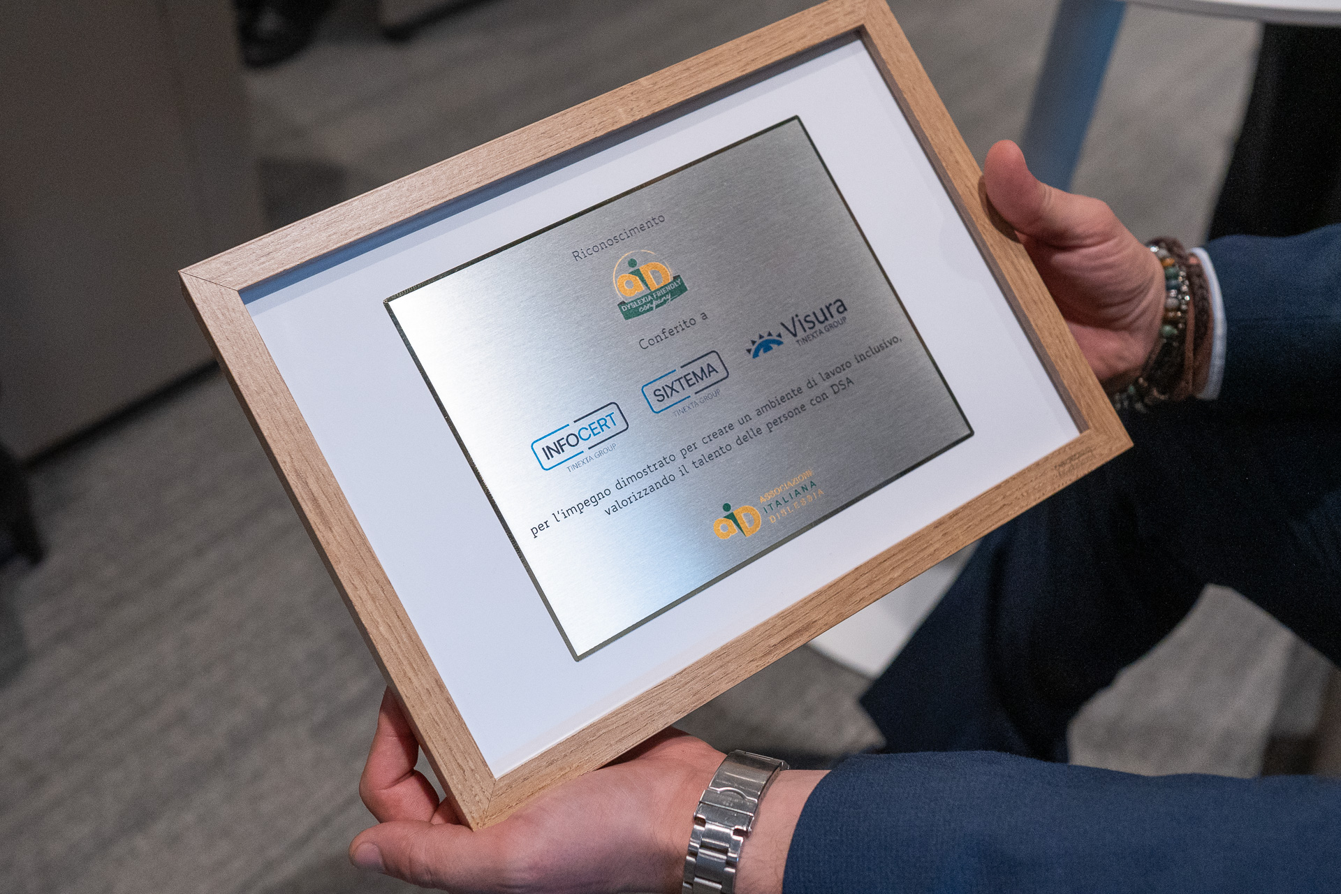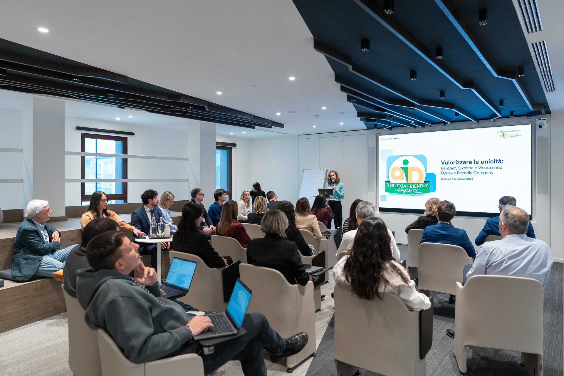 InfoCert, Sixtema e Visura, gruppo Tinexta, hanno ottenuto il prestigioso riconoscimento di “Dyslexia Friendly Company”. Il titolo è stato conferito da Federico Senese, membro del Consiglio Direttivo di AID (Associazione Italiana Dislessia) ai CEO delle tre società e ai rispettivi responsabili delle risorse umane, rispettivamente: Danilo Cattaneo (CEO InfoCert), Anna Maria Testa (HR Director BU Digital Trust di Tinexta Group), Claudio Scaramelli (CEO Sixtema), Alessandro Filardi (HRBP Sixtema), Andrea Vingolo (CEO Visura), Erika Federico (HRBP Visura).